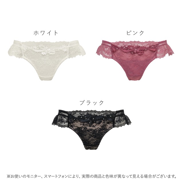 BRADELIS NewYork ブラデリス ナオミスタイルパンティ25A2 CA225322 3種類のレースを組み合わせた総レースの華やかなデザインのタンガです。 サイドからバックにかけて、ラッセルレースにギャザーを施した デザイン性の高い仕上がりです。 フロントの裏打ちは透け防止のため、ブラと同色のトリコットを使用しています。 なめらかで優しい肌触りです。 バックはストレッチレースを使用し、 フィット感が良くヒップを美しく見せる総レース仕様。 食い込みにくく快適な着用感です。 また、クロッチの肌側は、吸湿性の良い綿100%天竺を使用しています。 カラー: ホワイト・ピンク・ブラック サイズ(ヒップ): M(87-95)・L(92-100) 素材: ナイロン・ポリエステル・その他 フロント: ブラと同色のトリコットを使用。なめらかで優しい肌触りです。 クロッチ: 肌側は、肌触りが良く吸湿性に優れた綿100%天竺を使用。 ネームタグ: バックが透けるデザインのため、ネームを取り外ししやすい縫製にしています。(※洗濯や着用時に簡単に外れることはありません。) シャーリング: エンブロイダリーレース:なし ストレッチラッセルレース:あり モチーフ: なし 生産国: 中国製 トリコット: 風合いが柔らかくツヤのある伸縮性の少ないポリエステル素材の事。 ラッセルレース: ラッセルレース編機で作られたレースのこと。レースを編みながら柄を作っていくので、薄く平らな仕上がりが特徴。 綿天竺: 柔らかな綿素材。綿特有の保温性、吸水性に優れている。 シャーリング: レースの柄と柄を繋ぐ糸を編みこまずに浮かせて、カットすることで透け感や柄をすっきりとさせる手法。 ※ご覧頂いている商品の写真につきましては、 できるだけ実物の色に近くなるように努めておりますが、 照明の関係により、実際よりも色味が違って見える場合があります。 また、お使いの環境(モニター、ブラウザ等)の違いにより、 色の見え方が実物と若干異なる場合がございます。 予めご了承ください。 ショッピングバッグ (有料となります) リップル リボン型 ショッパー 袋 SS サイズ https://ripplu.thebase.in/items/64764987 リップル リボン型 ショッパー 袋 S サイズ https://ripplu.thebase.in/items/64765010 リップル リボン型 ショッパー 袋 M サイズ https://ripplu.thebase.in/items/64765031 ※衛生上、返品交換は不可となります。 万が一の不良品の場合を除き原則として返品はお断りしております。 又、不備・誤配送以外の返品、交換はご遠慮頂いております。 ※商品発送まで1週間~10日ほどお時間いただいております。 ※店舗にて同時販売のため、万が一品切れの際はご容赦ください。