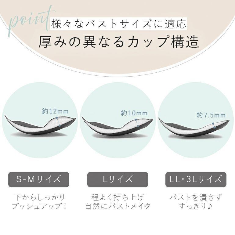 サイズにより形状を変更しています。S~Lサイズは下側に厚みのあるプッシュアップカップでバストを下から押し上げます。