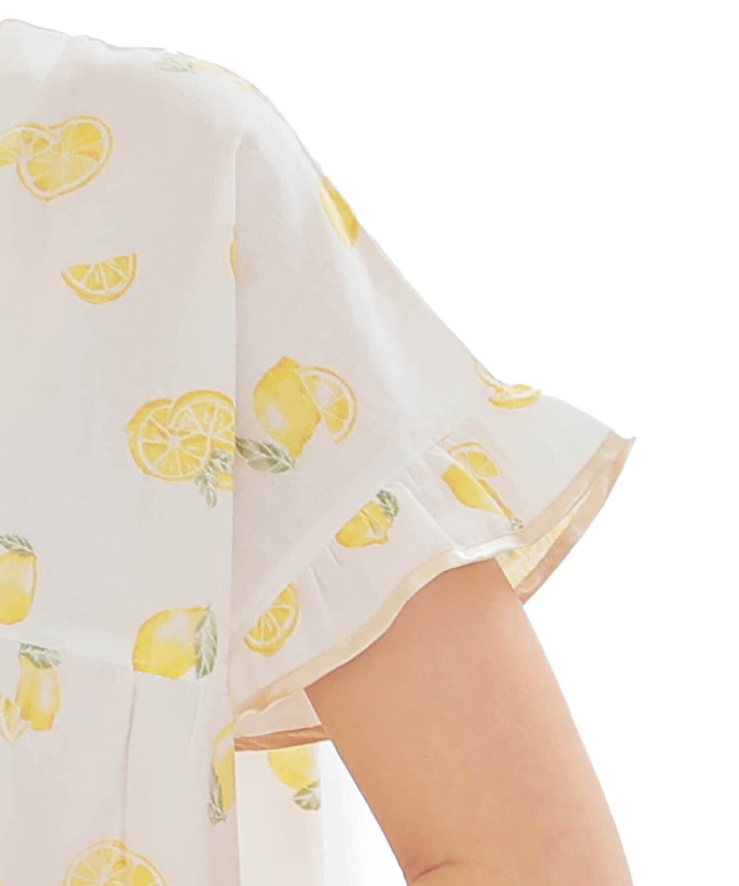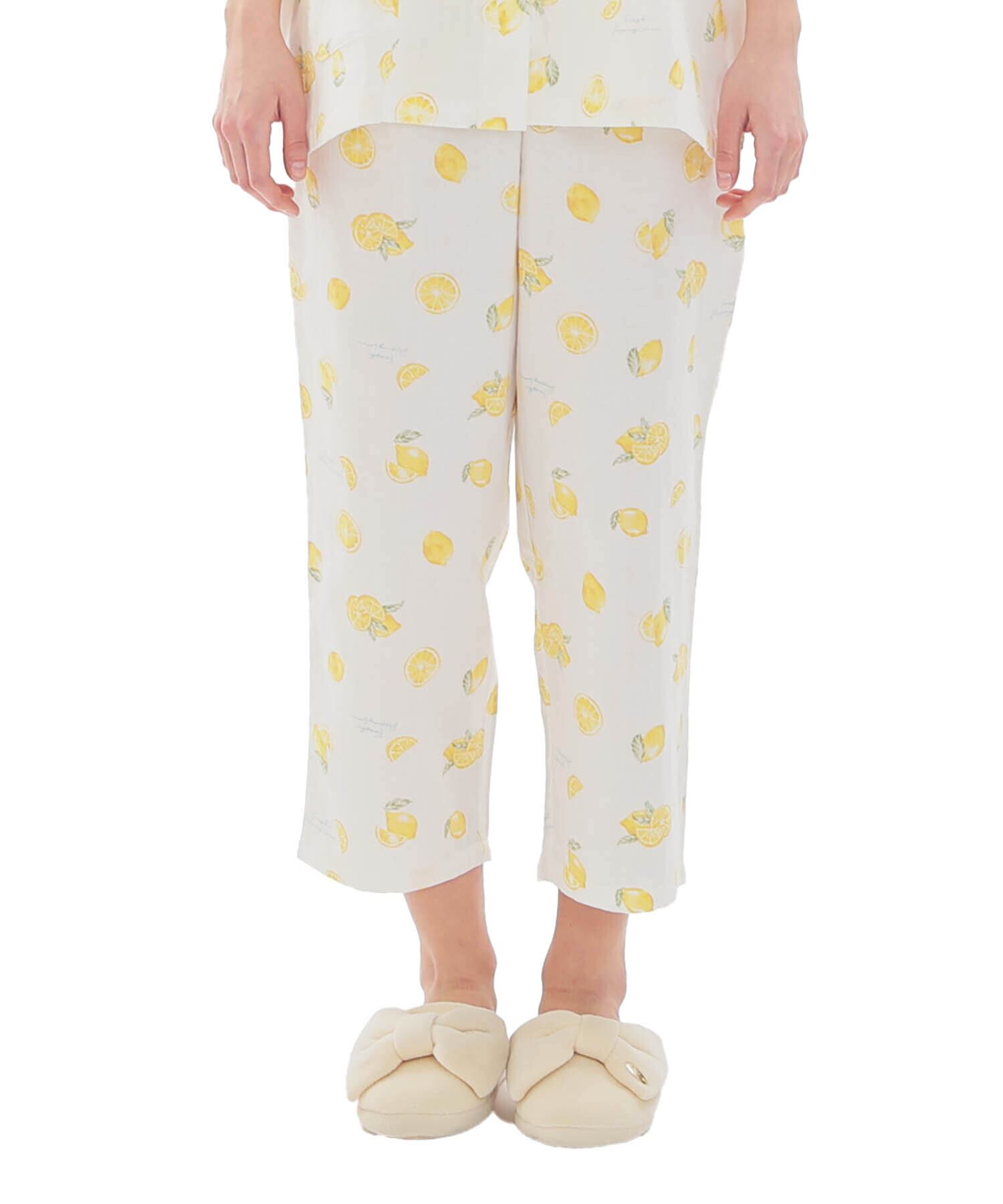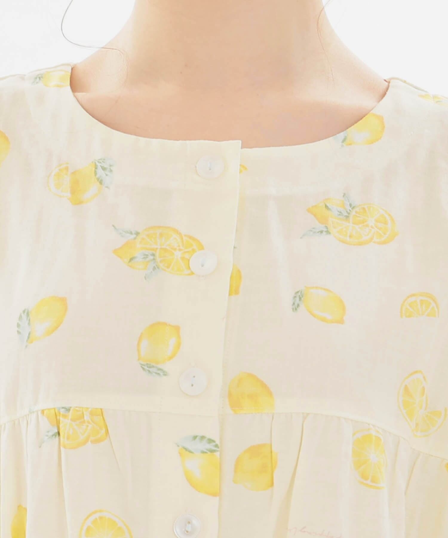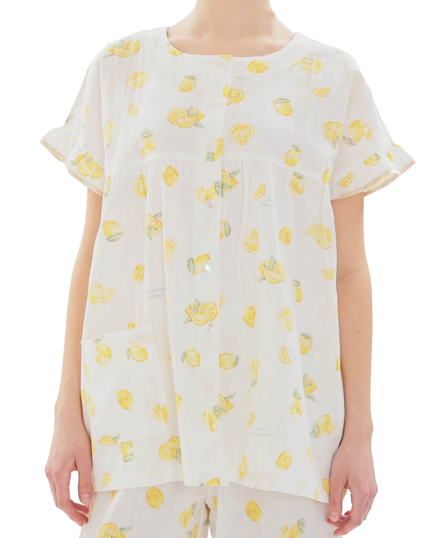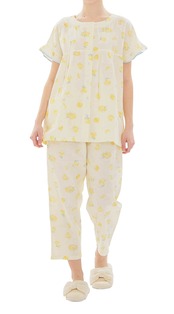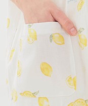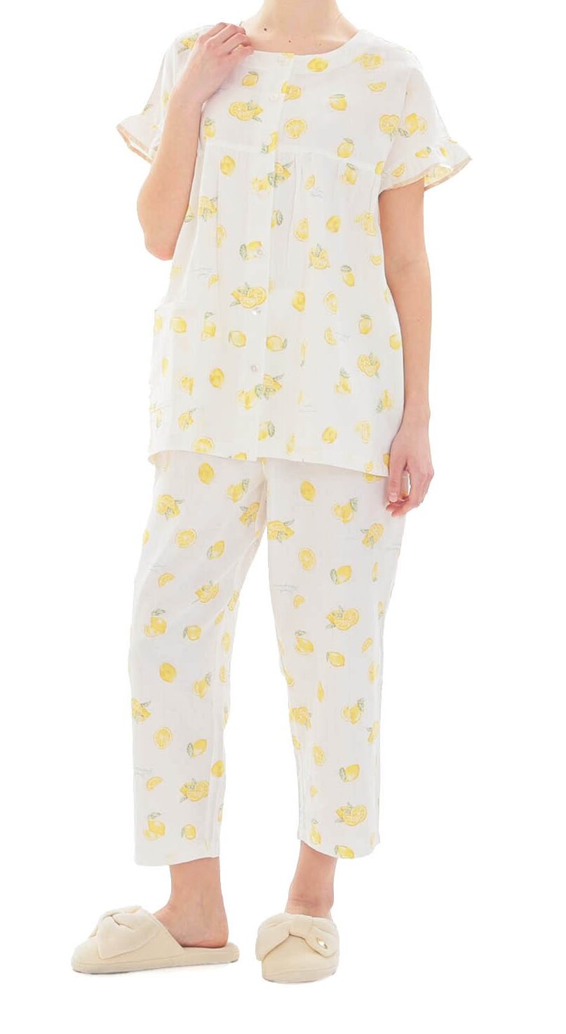 みずみずしいレモンを散りばめた、夏にぴったりの爽やかなデザインの半袖、前開きのパジャマ。
