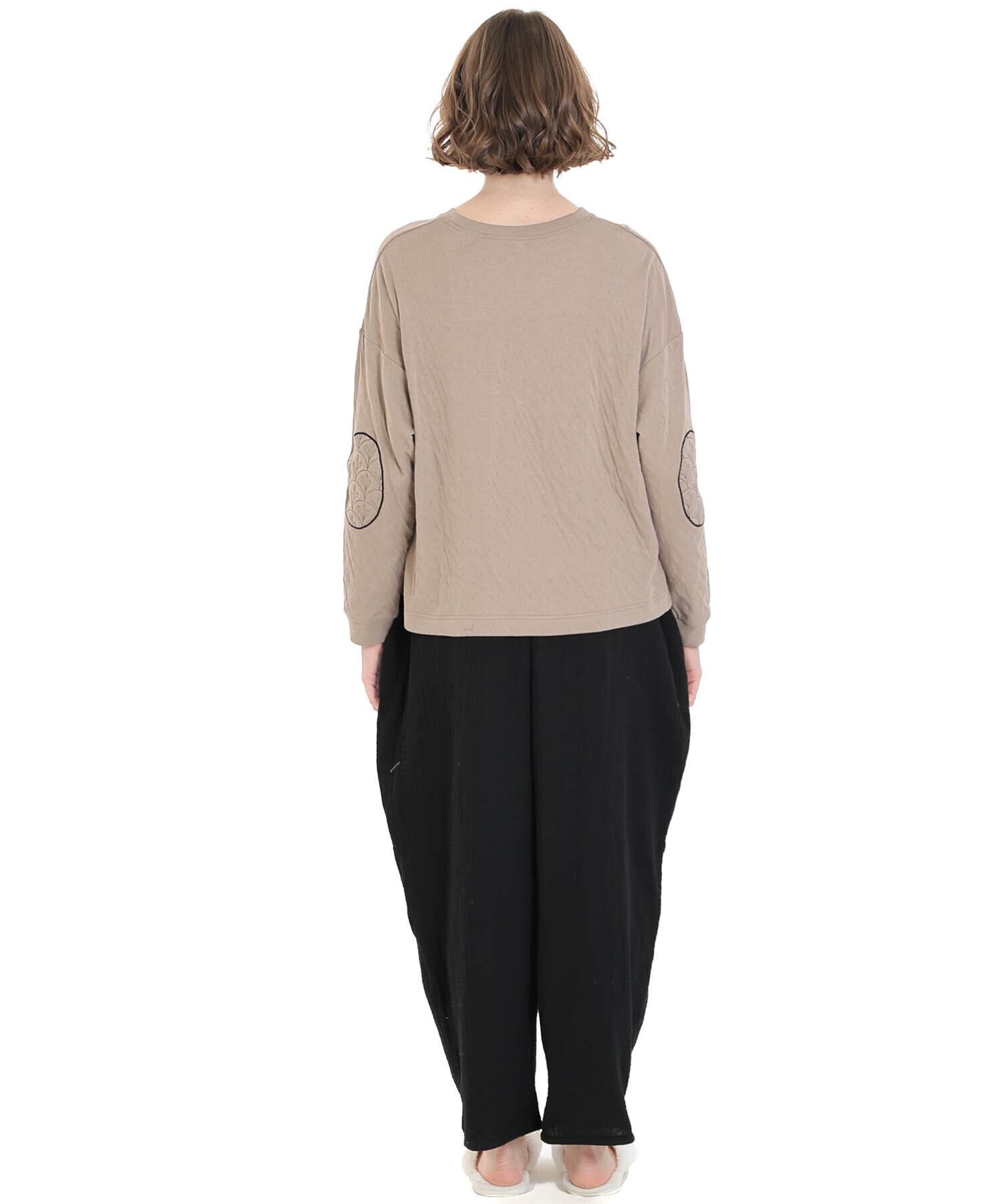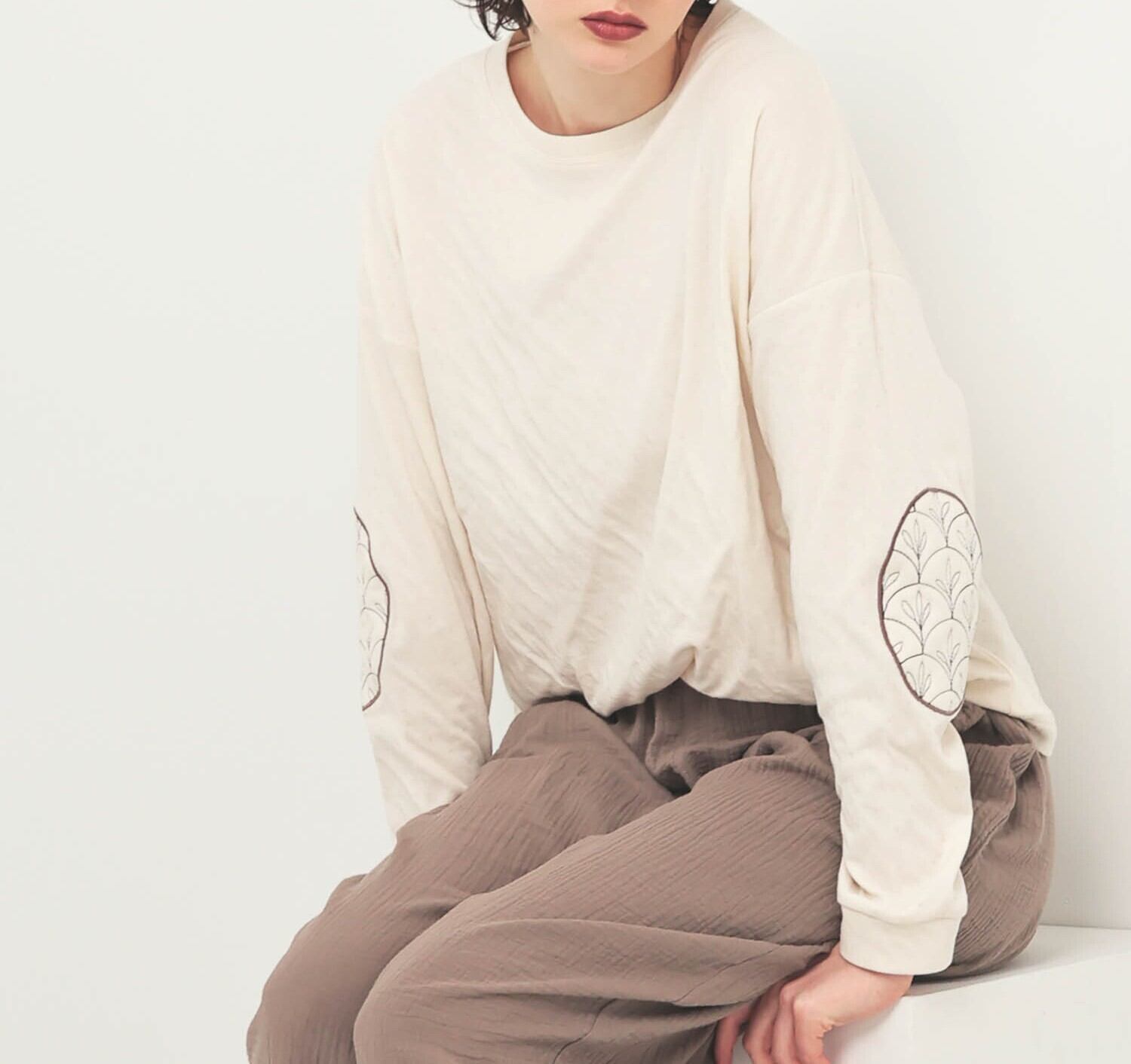 適度な伸縮性のある接結ニットのトップスとナルエーオリジナルのシュークリームガーゼのパンツを組み合わせたスペシャルなセットアップになっています。