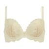 レース縦ダーツ仕様。レース表下にトリコットを重ねています。エンブロイダリーレースを使用しているためカップが立ちあがりやすく、しっかりとバストを寄せ上げ、綺麗な谷間を作ります。
