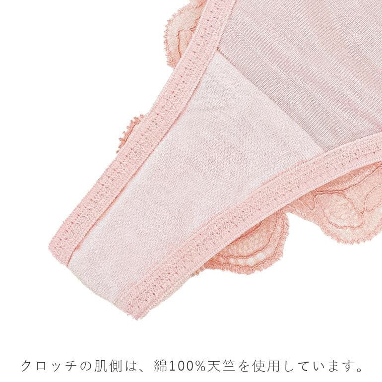 フロントの裏打ちは透け防止のため、ブラと同色のトリコットを使用しています。なめらかなトリコットは肌触りが良く、快適に着用いただけます。