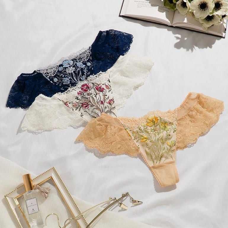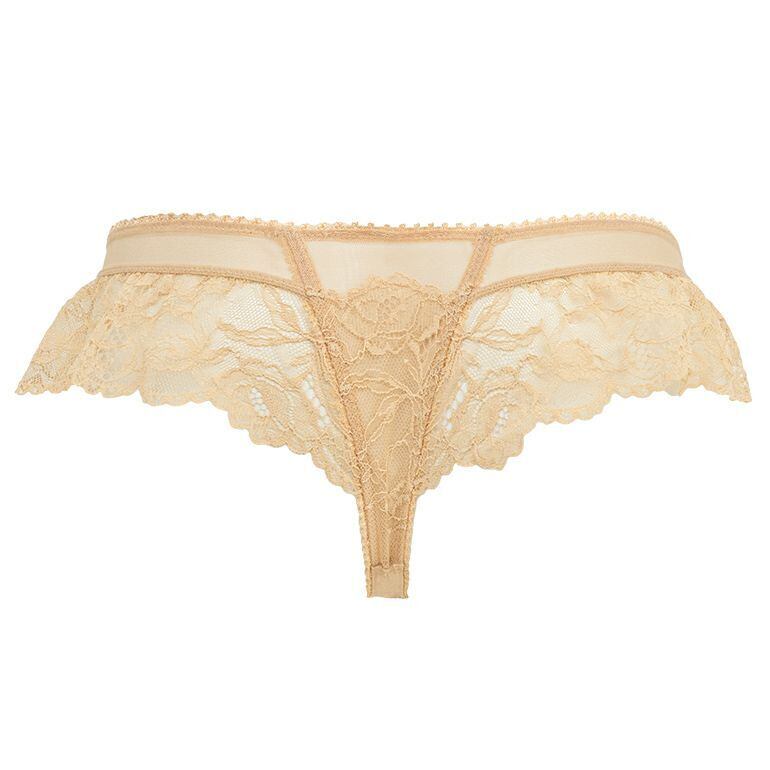 2種類のレースをふんだんに使用し、サイド~バックのラッセルレースにギャザーを入れたデザインのタンガです。