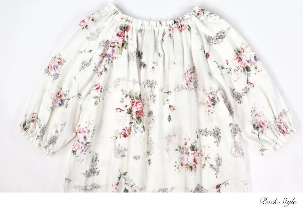 トップスは前後ギャザーでたっぷりと生地を使ったラグランスリーブ。